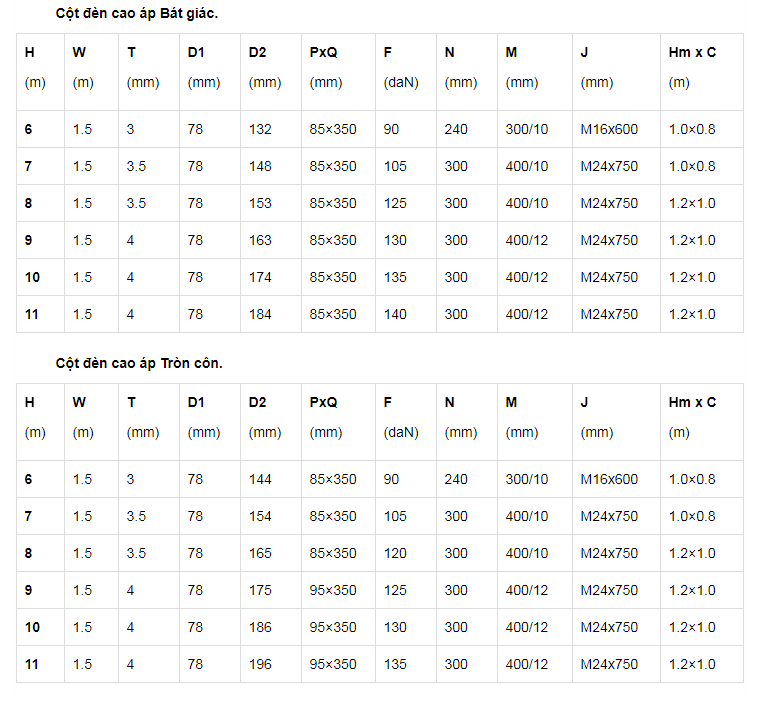 • Thân cột được chế tạo liền, khồng hàn nối ngang thân.