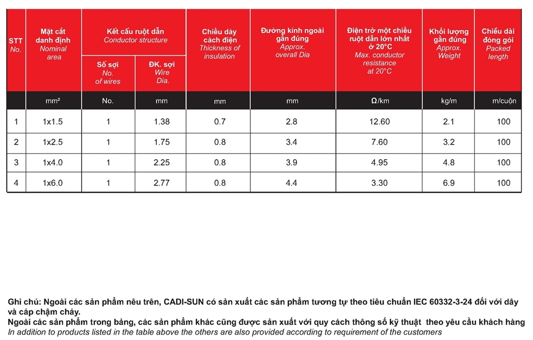 + Mặt cắt danh định: từ 0,5 mm2 đến 10 mm2