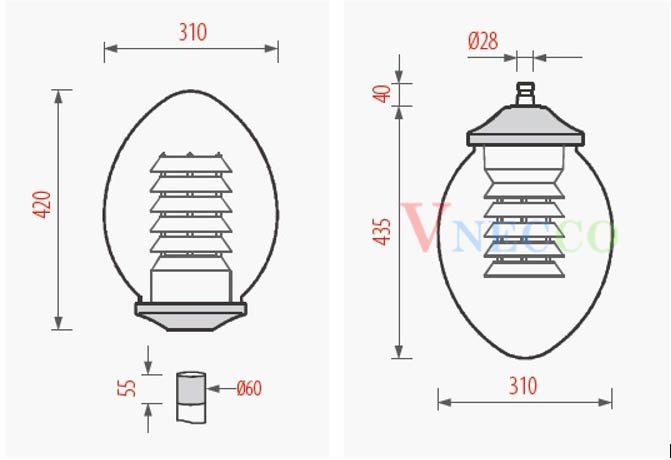 • Đèn lắp trên đầu cột Ø60, ngập sâu 70mm.