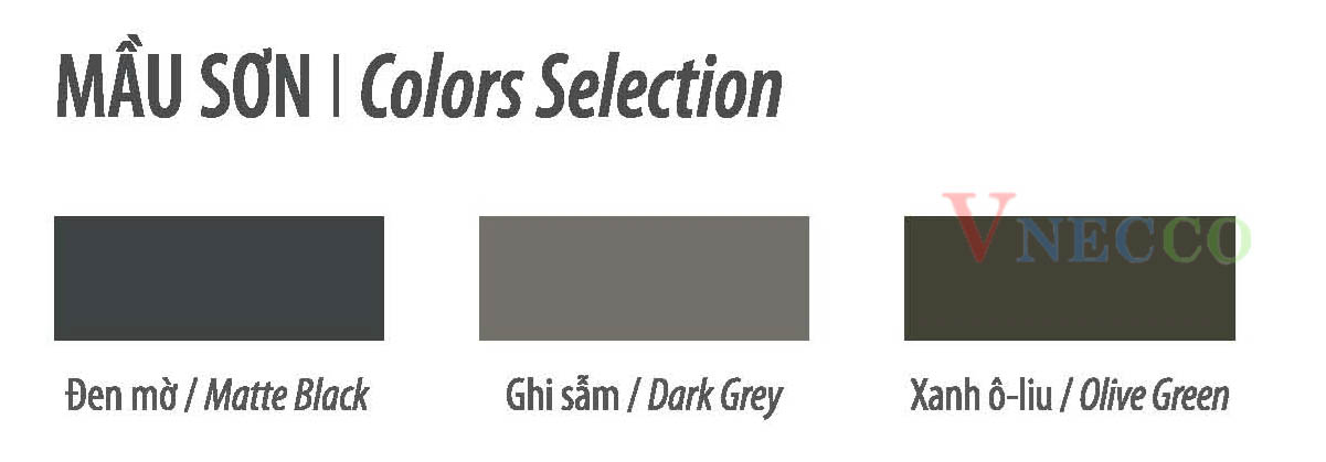 • Màu sắc: Đen mờ, ghi sẫm, xanh ô-liu