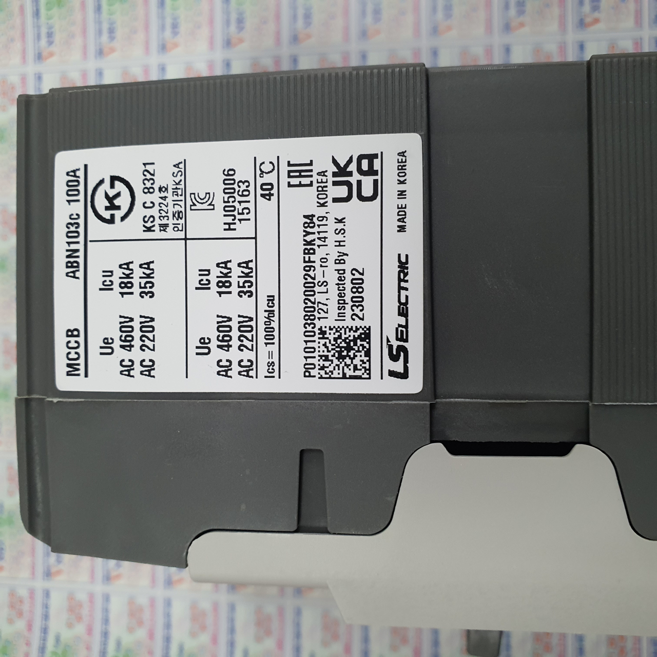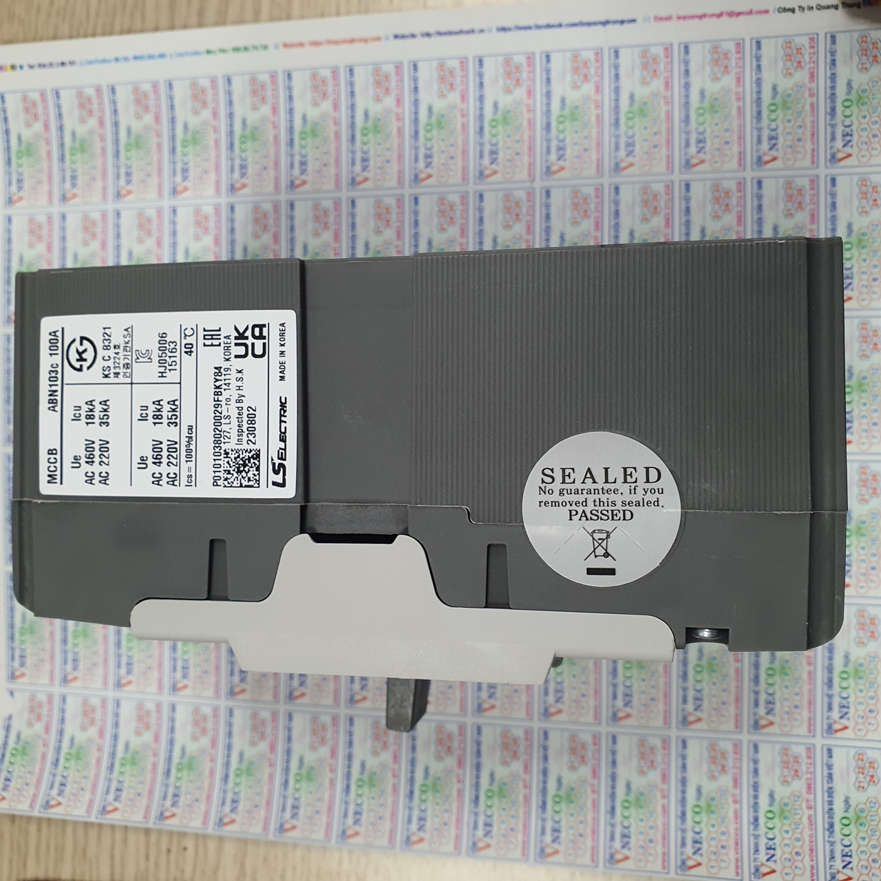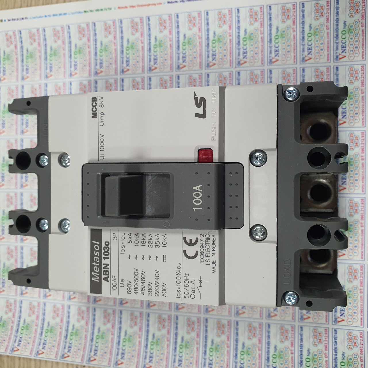 Cầu dao tự động MCCB Metasol LS ABN103cM Motor Protection Molded Case Circuit Breakers Dòng khung định mức: 100A Dòng định mức: 60, 75, 90 A Dung lượng cắt dòng ngắn mạch tối đa định mức I­cu: 380V : 22 kA 220V : 35 kA Số cực: 3 Điện áp vận hành định mức: 690V Dung lượng cắt dòng ngắn mạch vận hành Ics: 100%Icu Kích thước (W×H×D): : 75×130×60mm Ordering: Tên MCCB – dòng frame – số cực - dòng định mức. Ví dụ: ABN103cM 90A (3 cực, 90A)