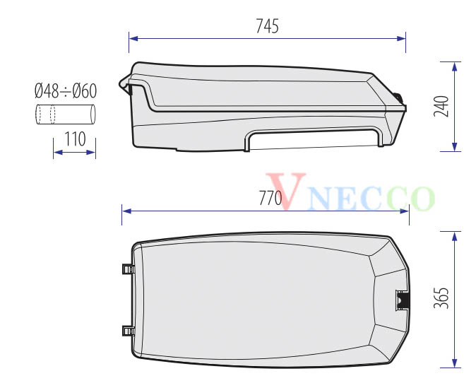 • Đèn lắp vào cần nằm ngang từ Ø48 - Ø60, sâu 110mm, góc nghiêng đèn theo thiết kế