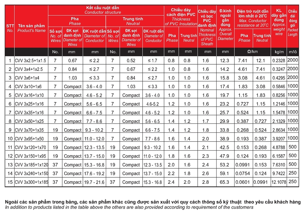 + Quy cách: Cu/PVC và Cu/PVC/PVC