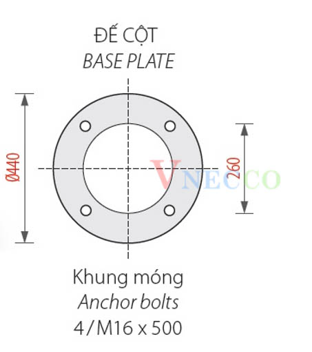 • Lắp đặt: Cột được liên kết với bê tông móng bằng 04 bu lông M16 240 x 240 x 500 x 4.