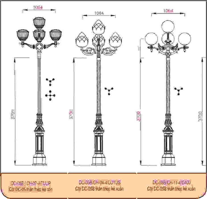 DC02 là loại cột đèn trang trí sân vườn có phần đế với các góc cắt rắn rỏi, kết hợp hoa văn hình lá, tạo cảm giác vừa nhẹ nhàng, vừa cứng cáp cho người nhìn. Cột DC 02 rất phù hợp khi lắp các dòng tay chùm cách điệu như CH-09-01, 06-04, 02-04.. hoặc đèn Miria, Zelda. Lắp cột DC 02 tại các công trình chiếu sáng sân vườn như nhà thờ tổ, danh thắng, di tích là lựa chọn tuyệt vời.