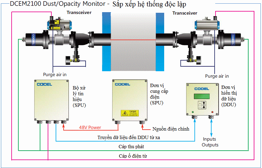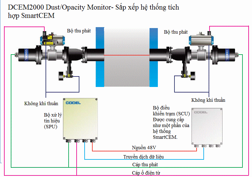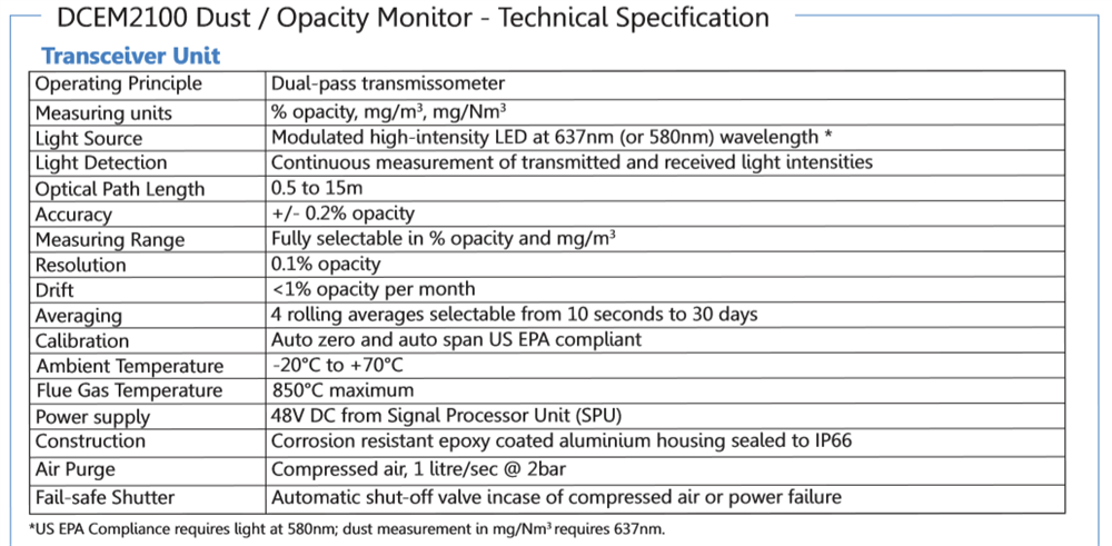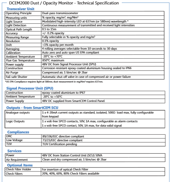 The DCEM2000 and DCEM2100 provide a continuous measurement of opacity or dust concentration in flue gases by continuously measuring the transmissivity of visible light across a process duct or stack. Its dual-pass optical arrangement is based on twin transmissometers measuring in opposing directions through the same section of the gas stream, providing not only an accurate average of the dust loading, but also providing a unique dynamic assessment of any misalignment errors due to stack movement. The measurement of opacity or particulate (dust) emissions from a process stack by measuring changes in optical transmission is simple in concept, the monitor must be insensitive to any other factors that degrade the optical transmission such as contamination of optical surfaces or gross misalignment.