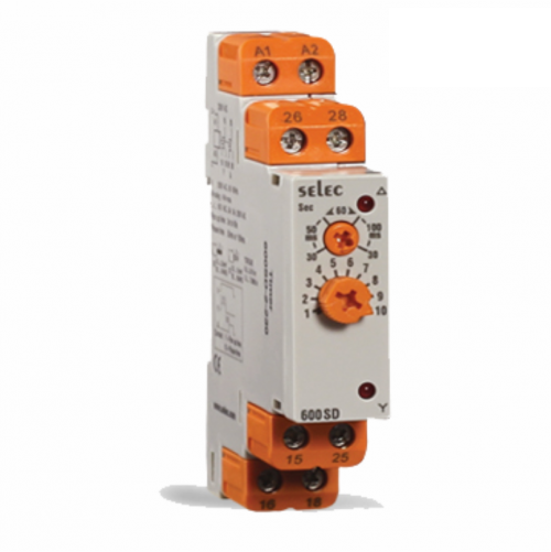Selec 600ST timer is an on delay timer, Selec 600 ST timer has 10 different time ranges,Selec 600 ST timer consists of front knobe for time range,Selec 600ST timer is slim,space saving saving design, 600 ST timer has comfortable DIN Rail mount.